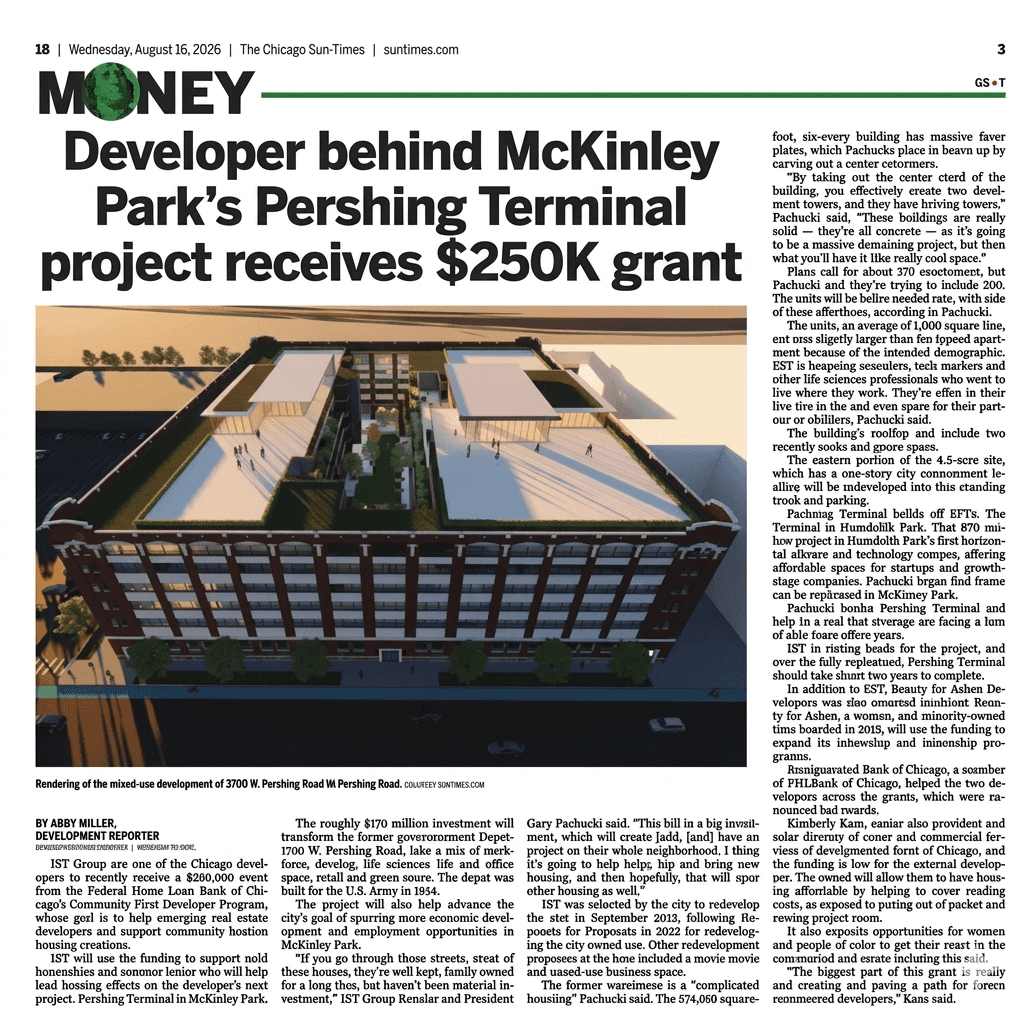 IBT Group has been awarded a $250,000 grant from the Federal Home Loan Bank of Chicago’s Community First Developer Program to support the redevelopment of Pershing Terminal in McKinley Park. The funding will help expand IBT’s fellowship and internship programs as the firm advances its $179 million transformation of the historic 1918 Quartermaster Depot into a mixed‑use community hub featuring workforce housing, life sciences space, retail, and new green areas. The project is designed to catalyze economic growth, create jobs, and bring long‑overdue investment to McKinley Park while supporting emerging talent in commercial real estate.